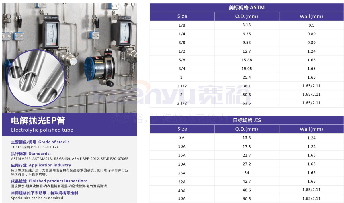 產品描述:電解拋光EP管,美標規格1/8- 2 1/2,OD3.18-63.5,wall 0.5-1.65/2.11mm.日標規格8A-50A,OD13.8-60.5,wall1.24-1.65/2.11mm